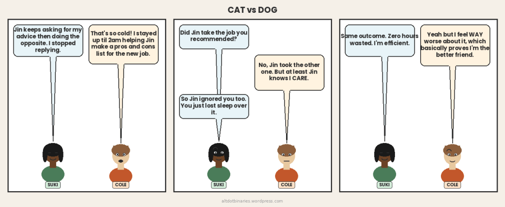 Obviously the answer is “it depends on what you needed.” If you needed competent, boundaried expertise, the Cat is your hero. If you needed someone to sit with you in the break room after a bad meeting and just be there, the Dog is invaluable. The problem arises when the Dog thinks she’s providing expertise and the Cat thinks she’s providing comfort. Because the Dog’s expertise is usually wrong, and the Cat’s comfort is usually absent.